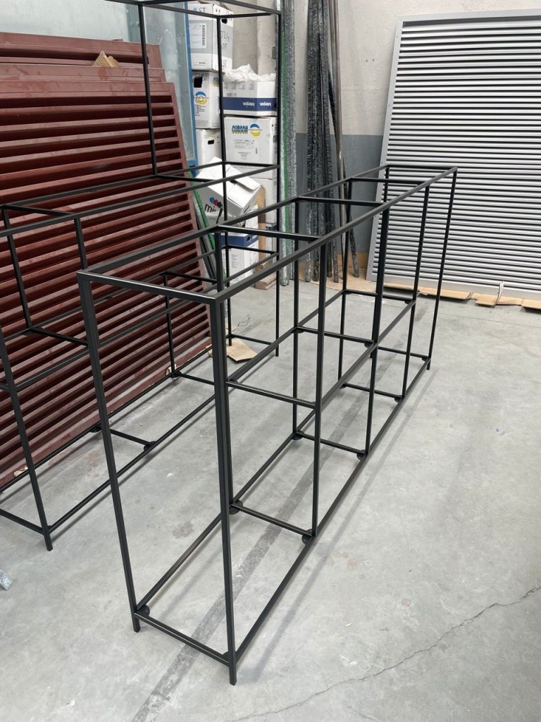 Trabajamos estructuras metálicas limpias, proporcionadas y duraderas, combinadas con baldas y superficies que aportan calidez, equilibrio visual y una presencia más noble dentro del conjunto. El resultado no es una pieza improvisada ni decorativa en exceso. Es mobiliario con carácter, con oficio y con una estética industrial depurada que encaja tanto en espacios contemporáneos como en interiores más cálidos y personales.